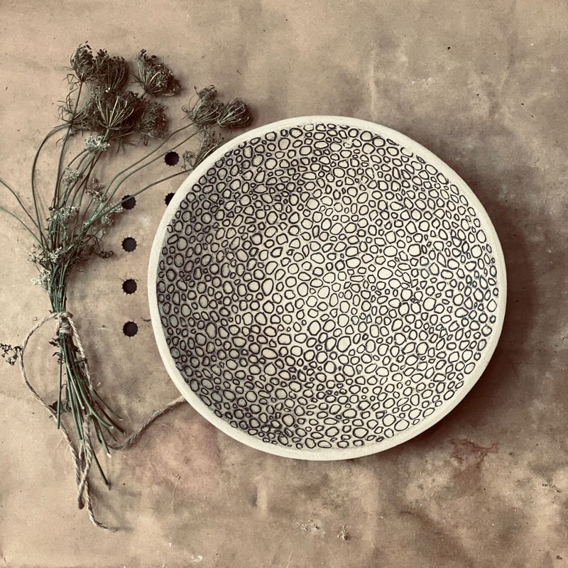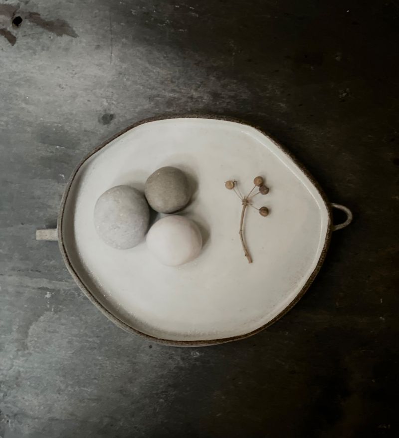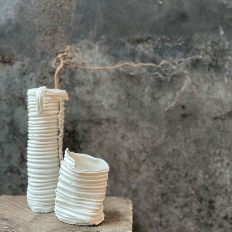 The textures and colours of collected stones, pebbles and rock formations inform my current work. Using traditional hand building techniques and a variety of clays I construct complementary ranges of tactile vessels whose surfaces reflect the smooth and the weatherworn. Experimental use of slips and glazes create finishes that range from highly polished to cracked and crazed. The unpredictability of smoke firing, obvara and horsehair raku are used for their ability to give subtle and unique markings. Monochromatic colours unify the pieces into a cohesive collection.